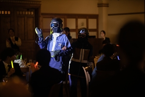 お色直し入場は スキーウェアを着たスタッフが登場