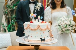 会場のカラフルでポップな世界観にピッタリのウェディングケーキに入刀した後は