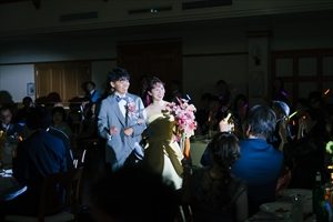 おふたり手作りの映像を見て頂いた後は ガーデンからおふたりが登場